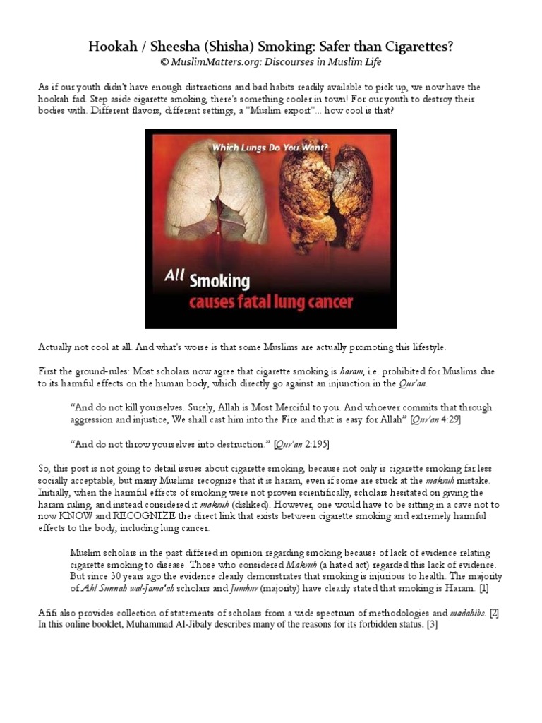 Nor kill or destroy yourselves: I do not believe cigarrettes are haram, smoking was around in the time of the prophet muhamed's (sas) time. There's a misconception that shisha is not as bad for. Nicotine has a minor effect on blood pressure and heart beat rate, similar to caffeine and other weak stimulants. Do you get any good effects by sheesha/smoking? Shisha has tobacco too, so its effects are the same! So is smoking shisha/pipe haram? Shisha, narghileh and smoking are all evil actions and are haraam, because of the harm they cause to one's body and wealth. Although smoking is not haram, it is discouraged in the religion. And if shisha smoking is harram? But the carcinogens and nicotine are still there. This is a long debate, we must have seen that some of the scholars are calling it halal while others are calling haram, to counter this, we have added zakir naik's stance about this matter; Shisha or waterpipe smoking is 'haram' (forbidden) for muslims, the fatwa (edicts) committee of the national council for islamic affairs shisha is clearly harmful to health;